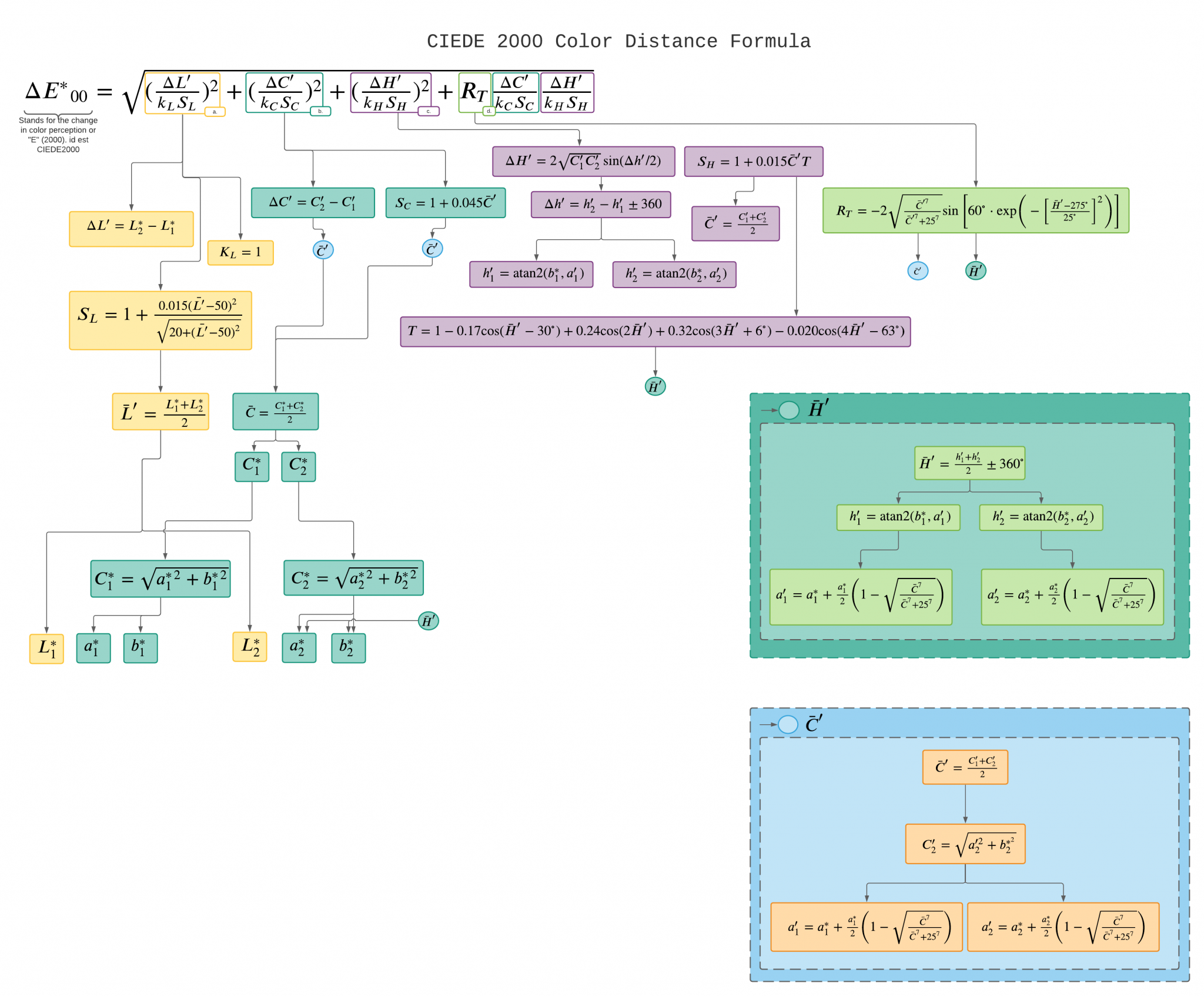 CIEDE2000 is a color distance formula for determining the perceptual distance between two colors in Lab* color space. It takes things into consideration such as “Is this color viewed on textiles or on a screen? Is this color very light or very dark? Is it very blue? etc.” Think of CIEDE 2000 as the basic Euclidean Distance of Lab* color space. Unfortunately for us, it is anything but simple. If you are really interested, I recommend starting at the wikipedia page for color difference formulas and working from there. I will only be covering it at a high level and sharing what helped me during the implementation phase.