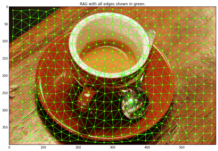 A Region Adjacency Graph is formed by drawing a line between each centroid, or center of a superpixel, of the above clustered image. Then each line is given a “weight” based on how similar that centroid is to the one it’s connected to. This graph doesn’t do anything for us on its own, other than look cool, but it does provide a framework for merging similar superpixels.