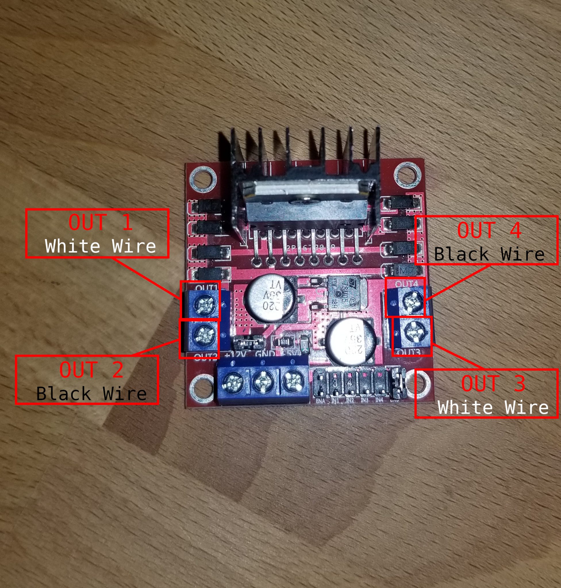 Each Motor has both a white and black/white striped wire. These will be connected to the output terminal blocks on the L298N board. Just follow the diagram below (if you are using the same kit as me, otherwise there may be some trial and error to determine which polarity to use for your motors. If one, or both, motors are turning in the wrong direction and you know the code is correct, then try swapping Output 1 for Output 2 or Output 3 for Output 4.