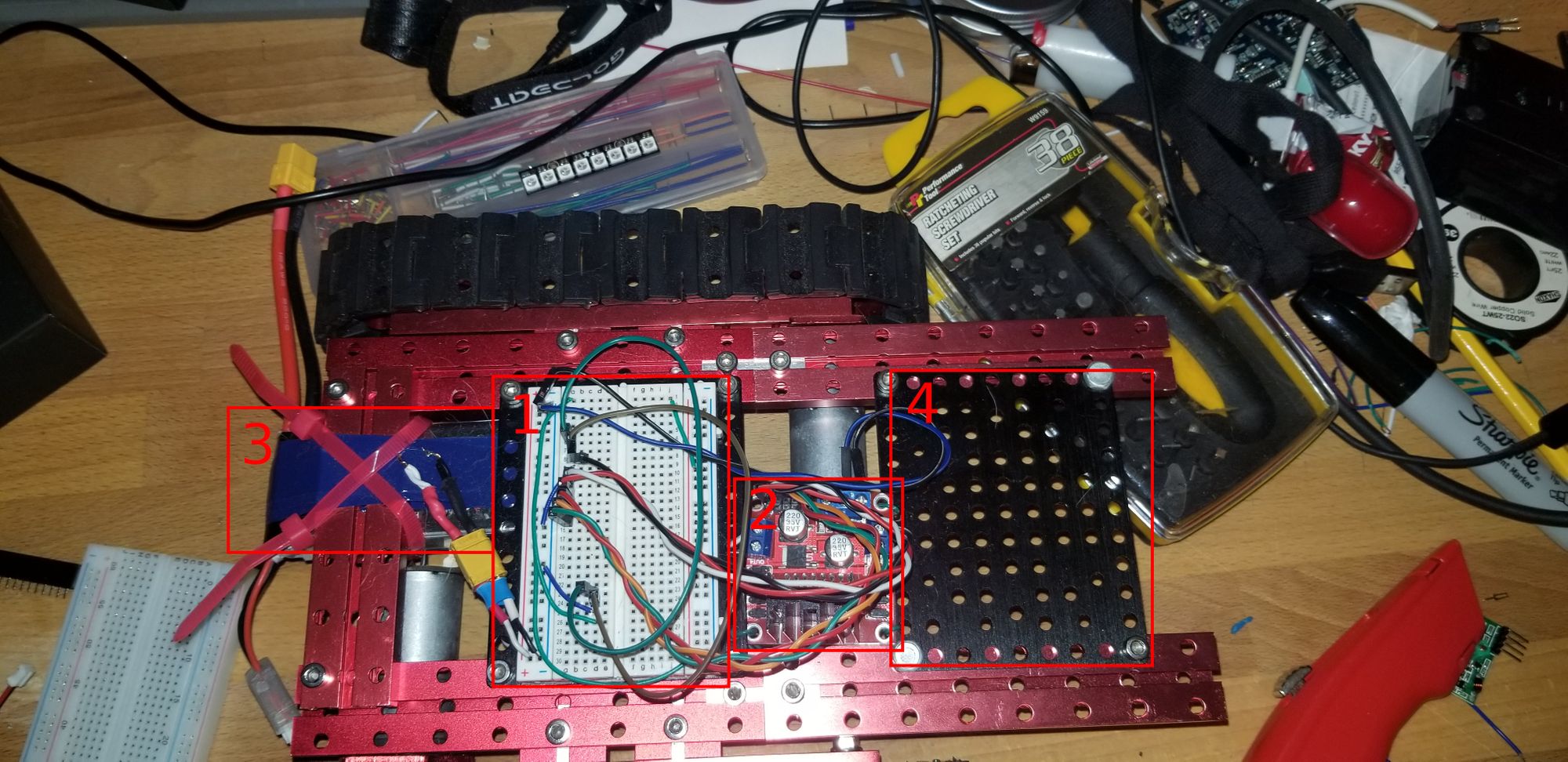 - Tank Chassis – https://www.osepp.com/robotic-kits/4-tank-mechanical-kit I used a whole tank kit from OSEPP. The chassis is high quality extruded aluminum, but the tracks are made of a pretty cheap rubber that doesn’t seem to work well on high friction surfaces like carpet. But it also includes two motors that fit perfectly with the chassis to make for a pretty solid drivetrain system; so the tradeoff was worth it.